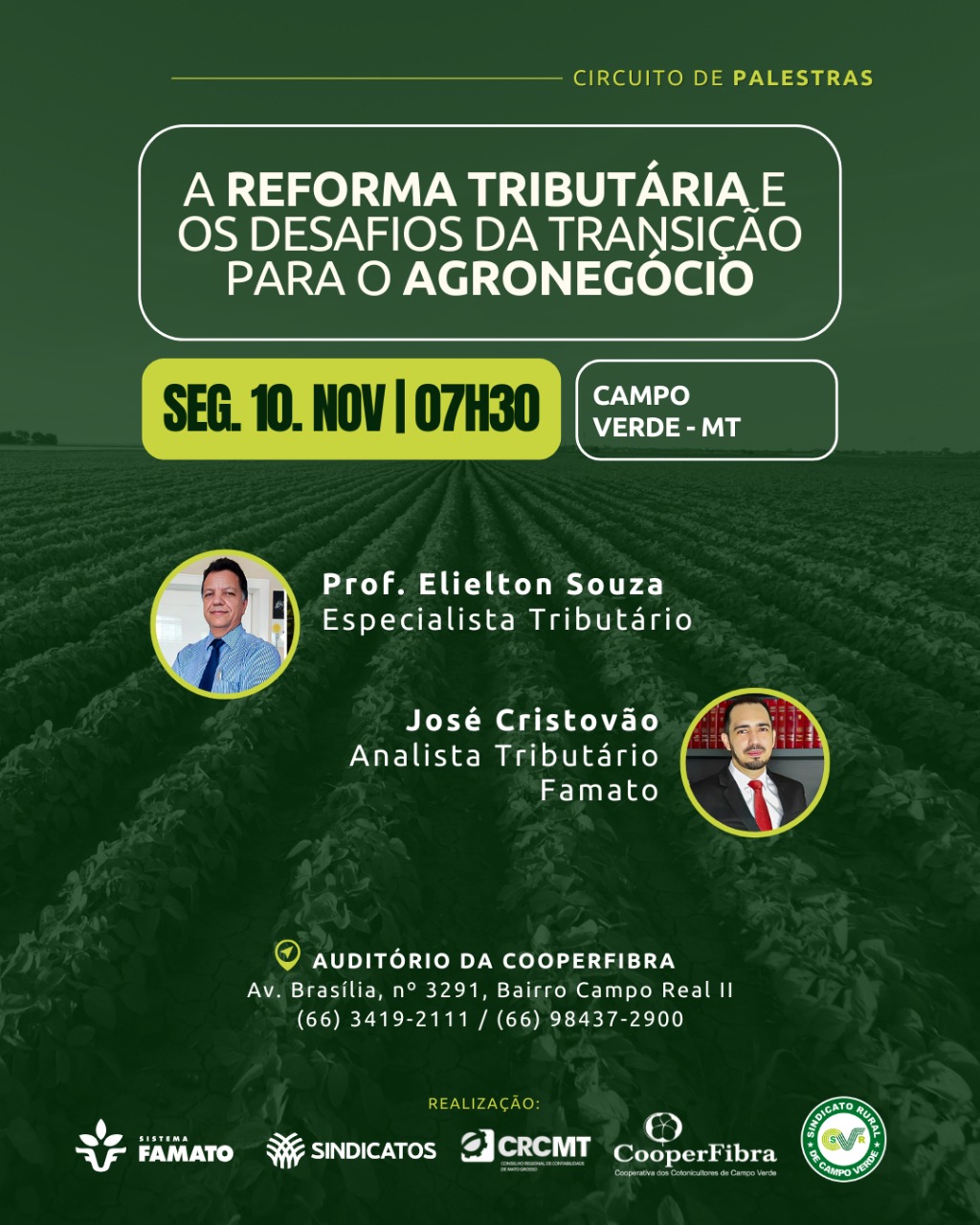 O evento acontece em Campo Verde, no dia 10 de novembro (segunda-feira), às 7h30, no Auditório da Cooperfibra (Av. Brasília, nº 3291, Bairro Campo Real II).