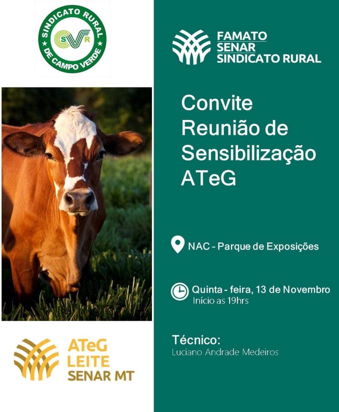 O Sindicato Rural de Campo Verde, em parceria com o Senar-MT, realiza nesta quinta-feira, 13 de novembro, a Reunião de Sensibilização do Programa de Assistência Técnica e Gerencial (ATeG) – Leite. O encontro acontece no NAC, no Parque de Exposições de Campo Verde, a partir das 19h.